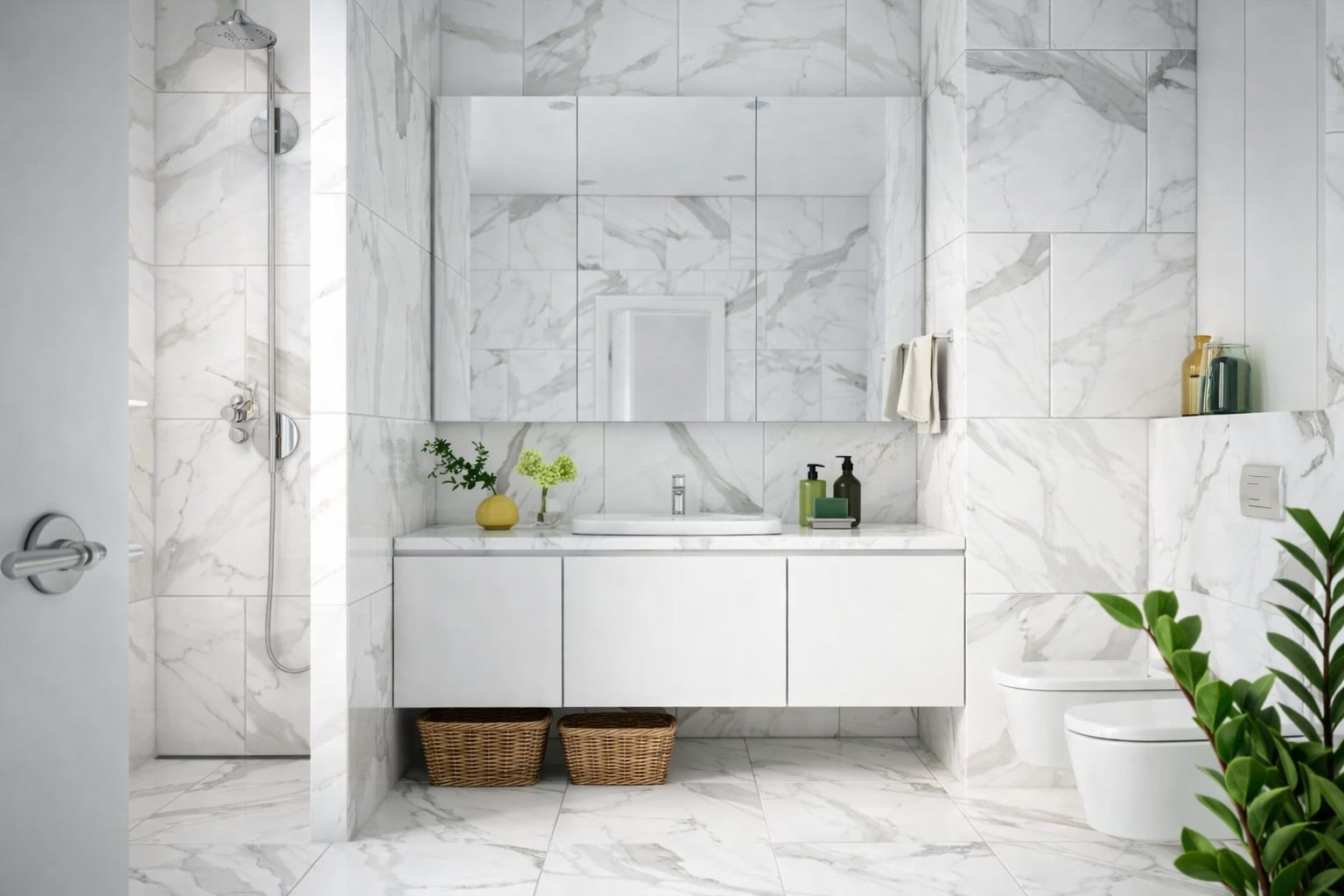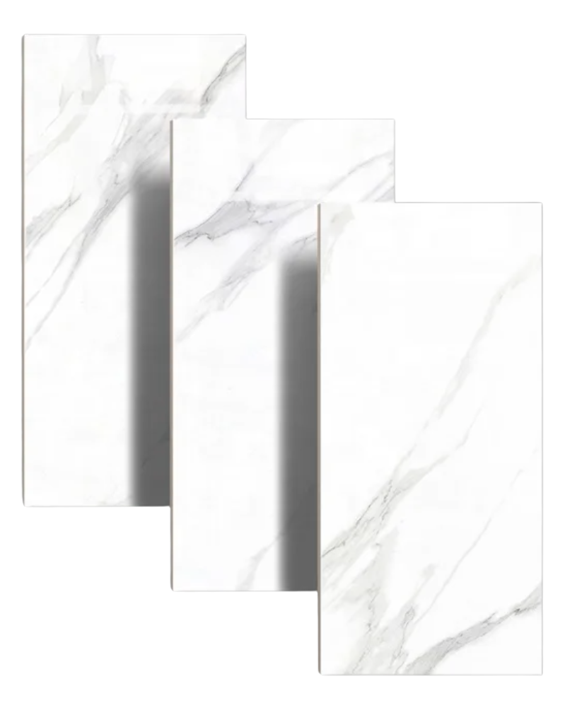 Luxury Calacatta white marble-look porcelain slab for kitchen countertops, bathroom vanities, walls, and floors. Waterproof, scratch-resistant, and ultra-durable with elegant gray veining. Price is per square foot (sq ft).